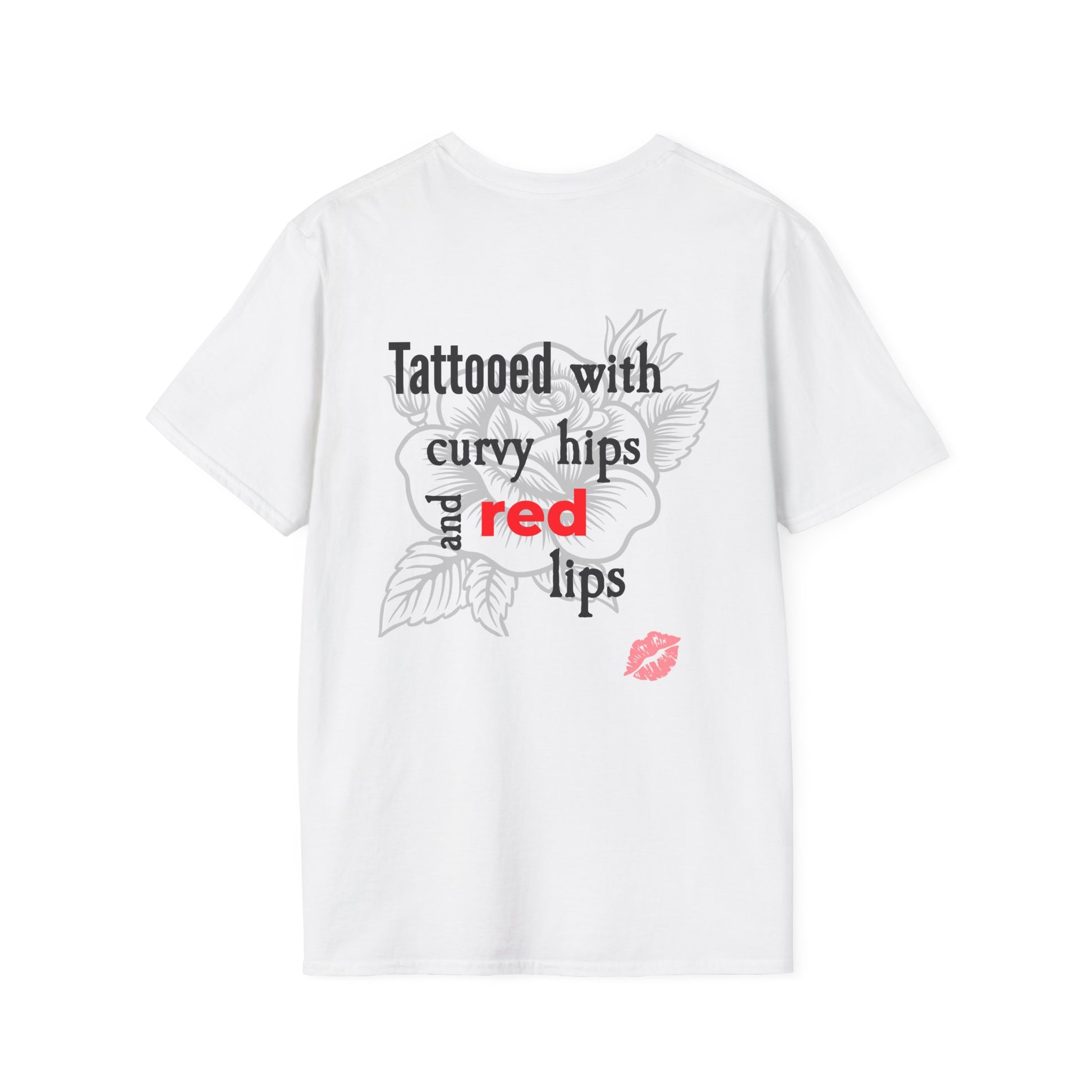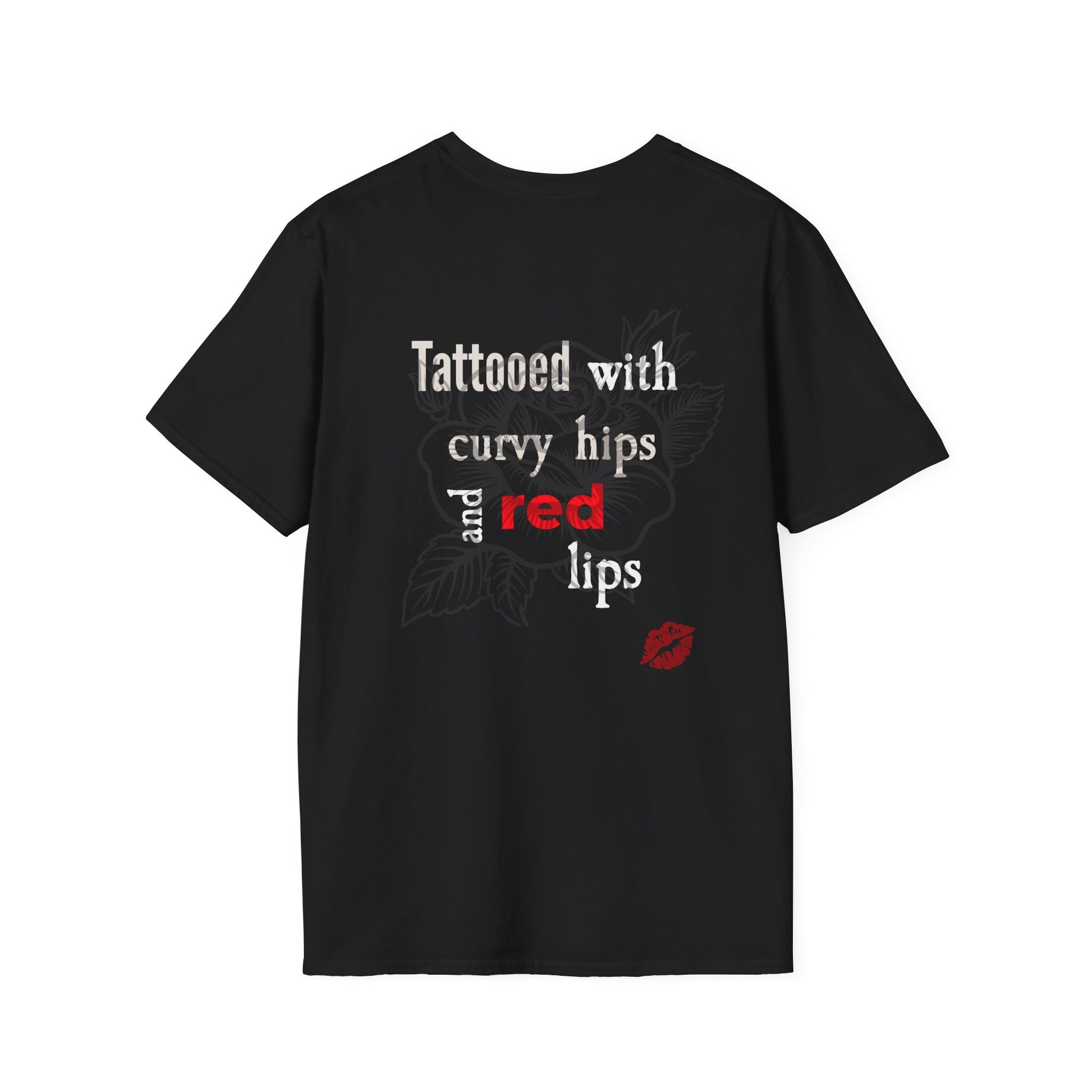 A bold and edgy unisex T-Shirt featuring red lips with a tattooed design. This T-Shirt exudes a rebellious and stylish vibe, perfect for those looking to make a statement. Ideal for adults who want to add a touch of intrigue to their wardrobe.