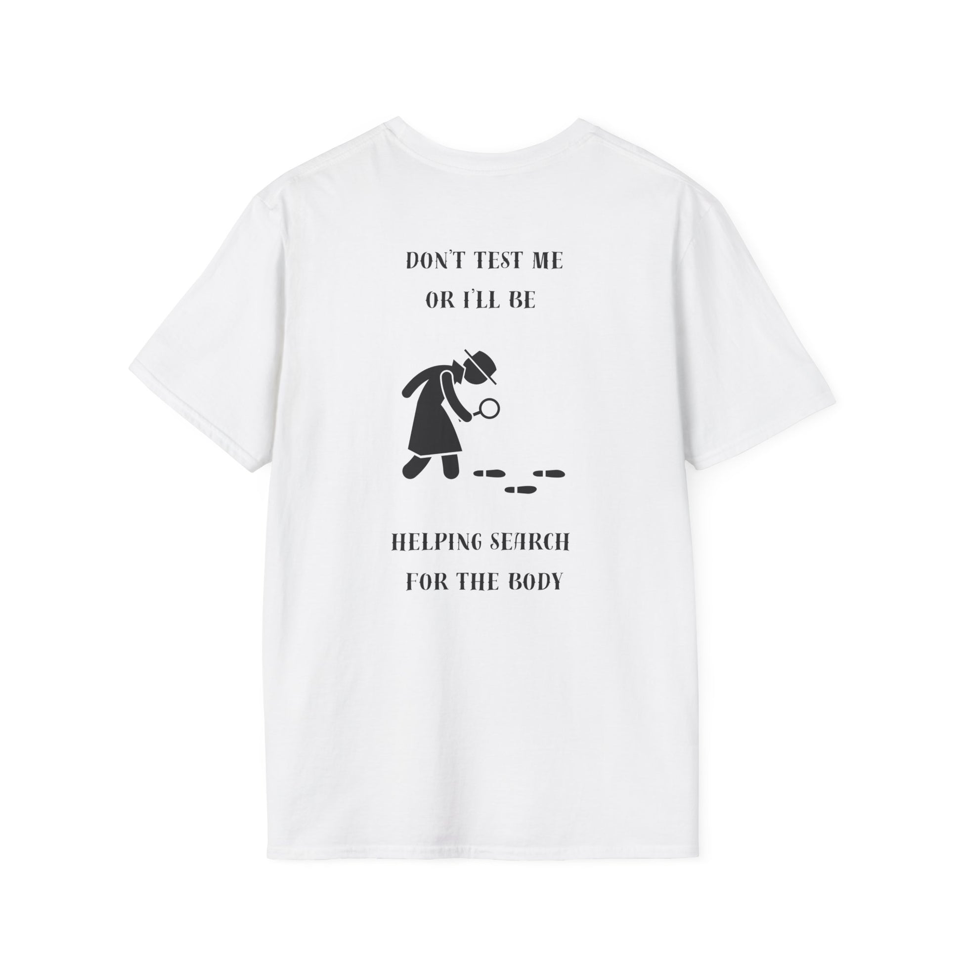 A humorous and fun T-shirt that encourages people to search for the body, giving off a playful vibe. Perfect for those who appreciate a good laugh and enjoy witty designs. Ideal for everyday wear or casual outings, suitable for adults. Great for gifting on birthdays, holidays, or special occasions.
